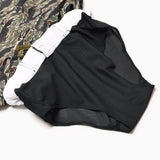 日本製のオリジナルボディは、スイムウェアをモチーフに、ウエストに紐、裾はラウンドしたスポーティさを感じるハイブリッドデザイン。背面腰部には三連のパワーメッシュポケット。180度開脚可能な股部分のガゼットはストレッチ素材で、動きやすさを追求したディティール。